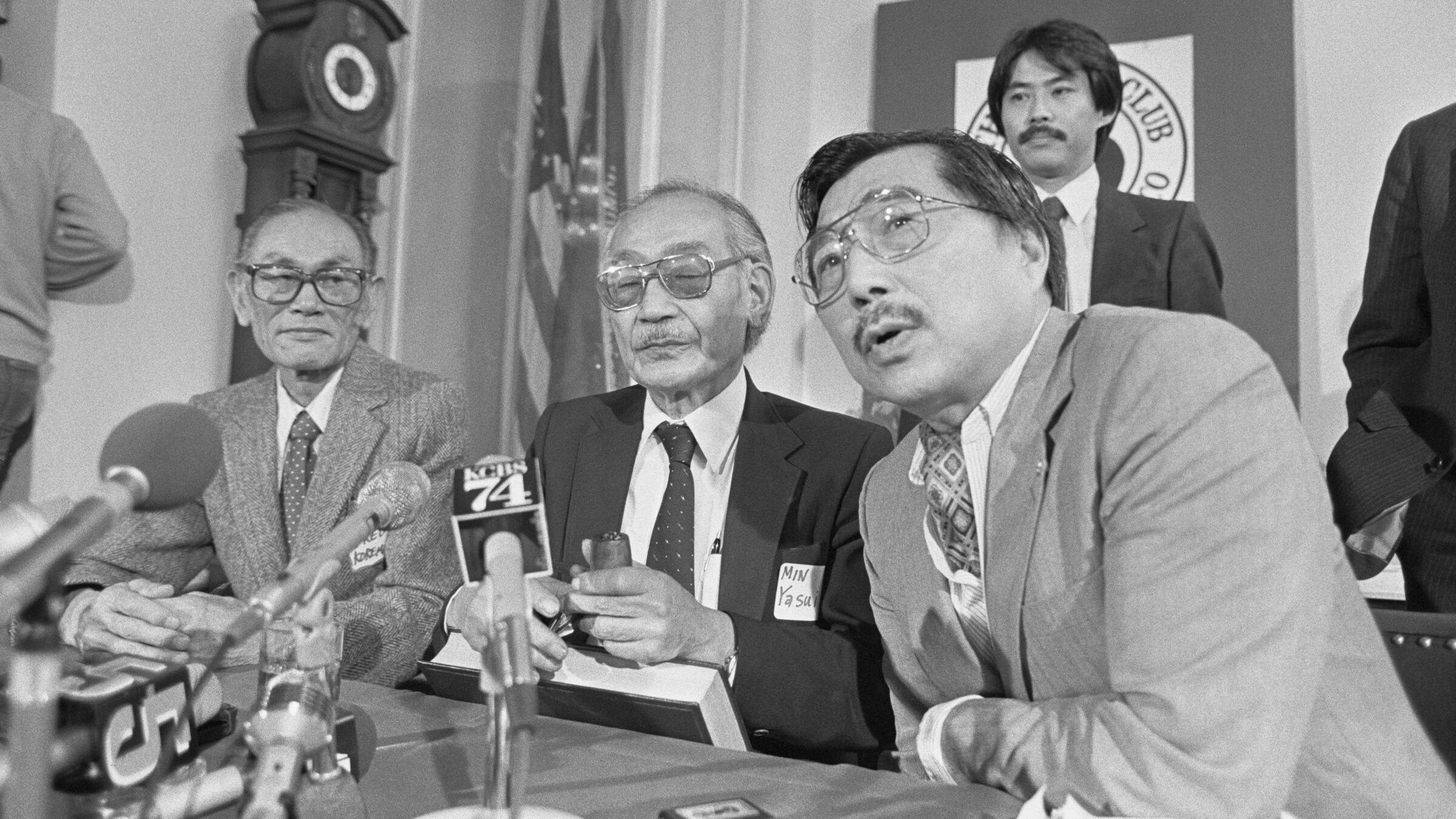 Fred Korematsu (left) at a press conference announcing his lawsuit against the federal government, January 1983 (Bettmann/Getty Images)