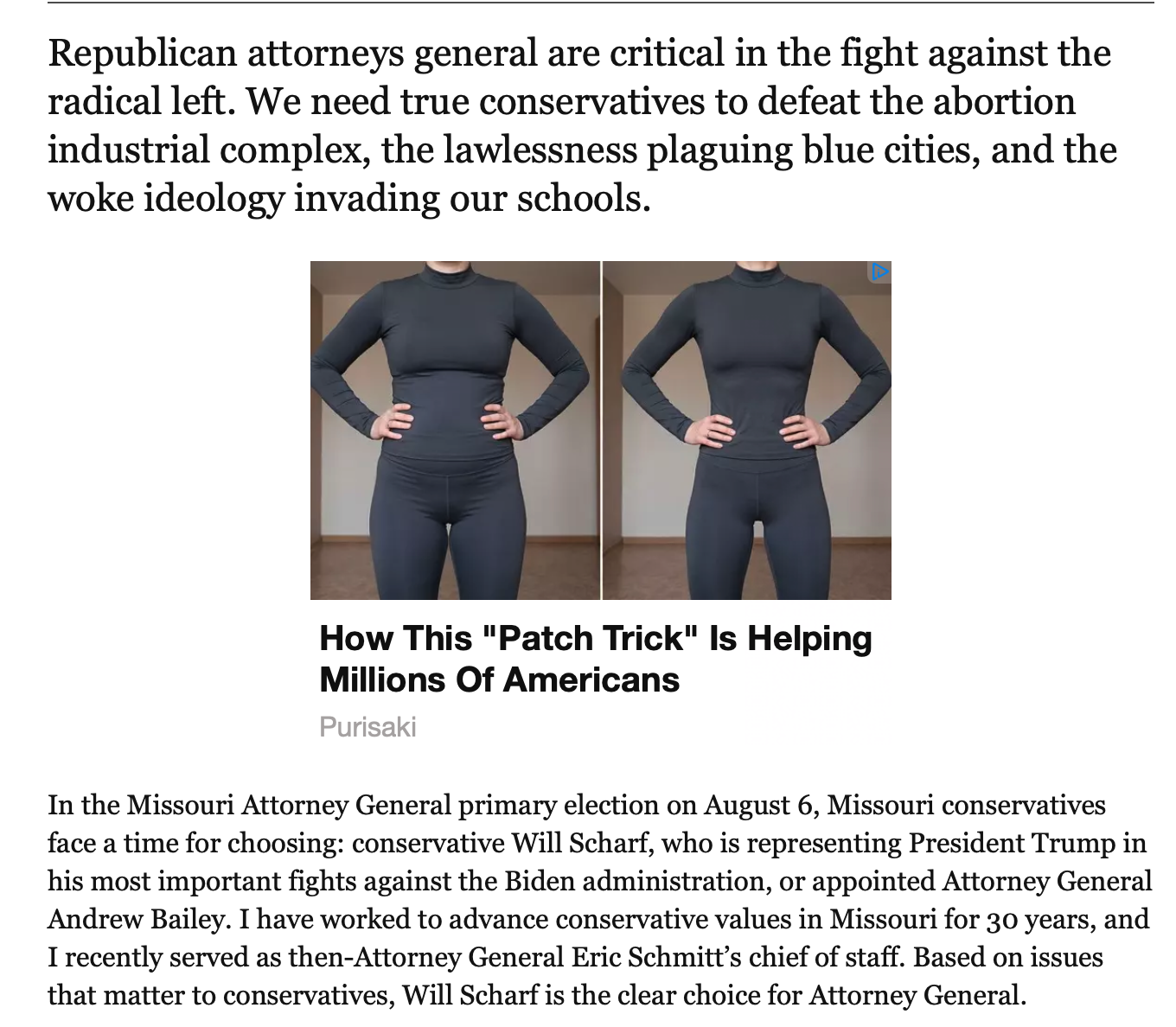 For anyone unpersuaded by Scharf’s history of pro-Trump activism alone, though, Smith asserted that Scharf would be “the fighter the pro-life movement needs,” and blamed Bailey, a staunch Trump sycophant in his own right, for fumbling away opportunities to make abortion care even more difficult for Missourians to access. Throughout the rest of the op-ed, Smith sprinkled in a bingo card’s worth of Fox News buzzwords—“critical race theory,” “DEI surveys,” and the dreaded “school mask mandates”—just to make extra clear to Republican voters that, if they really wanted an attorney general who shares their values, Scharf was the “clear choice.”
