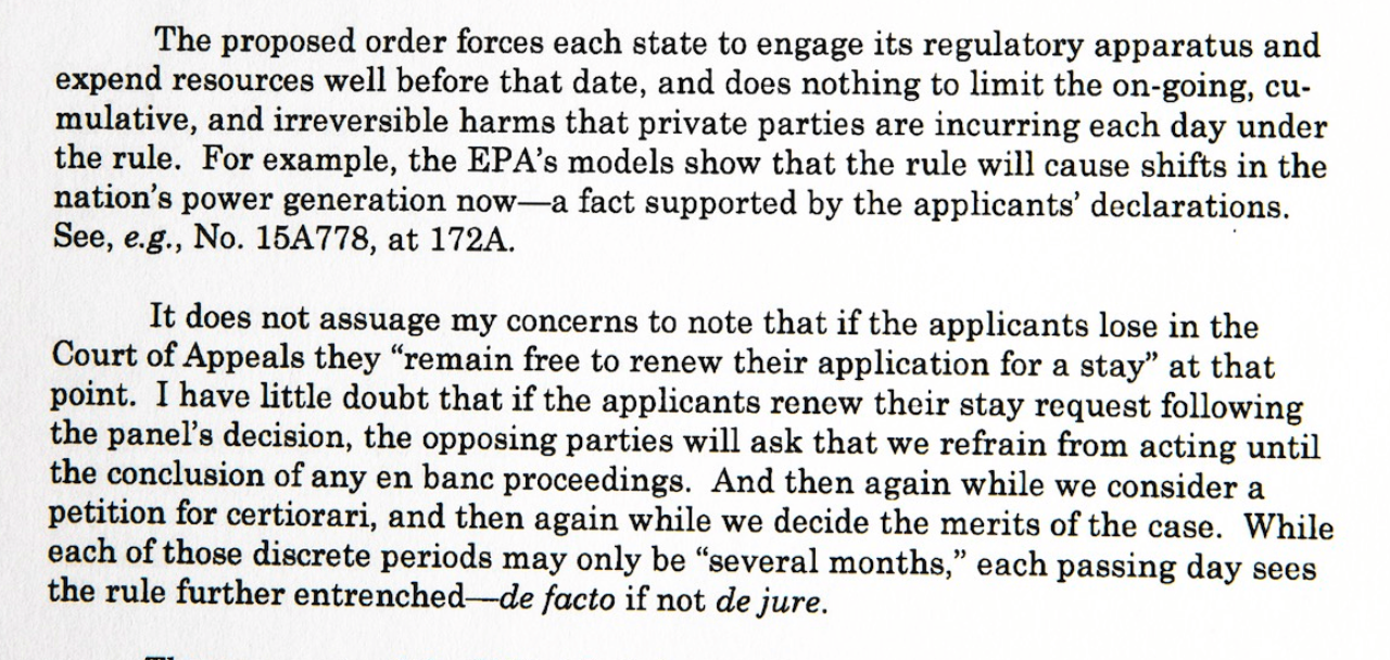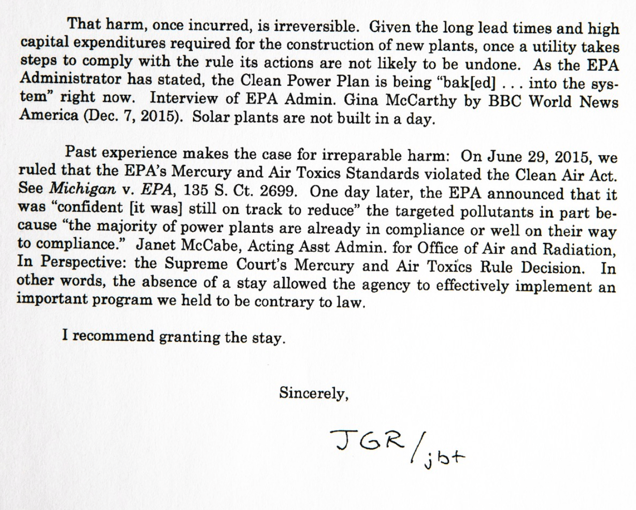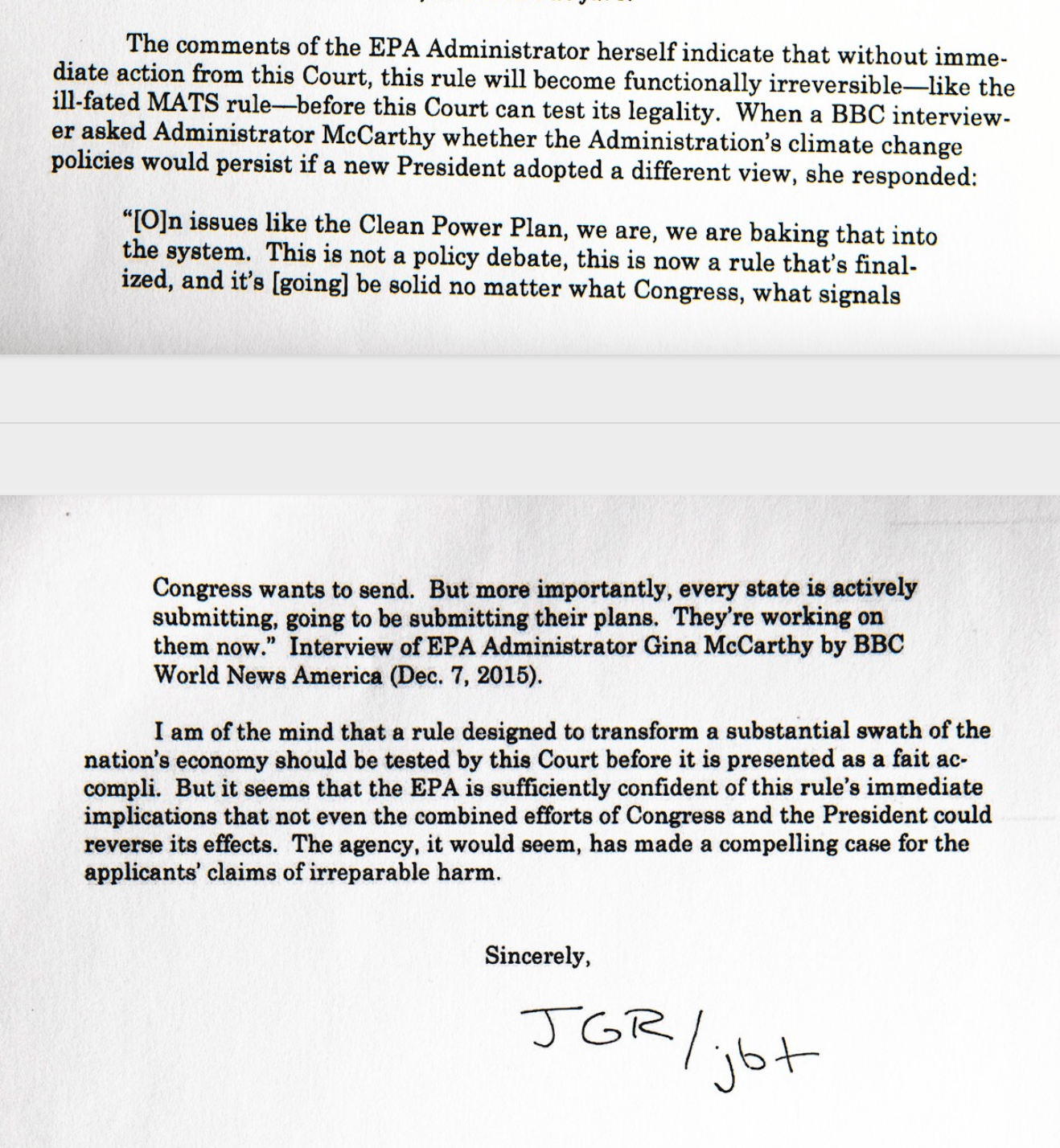 Throughout his second memo, Roberts emphasized the rule’s “real-world impacts” on his beloved energy sector, and closed by again citing McCarthy’s BBC interview as evidence that the Clean Power Plan would become “functionally irreversible” if the Court did not act immediately. “Each passing day,” Roberts wrote, “sees the rule further entrenched.”