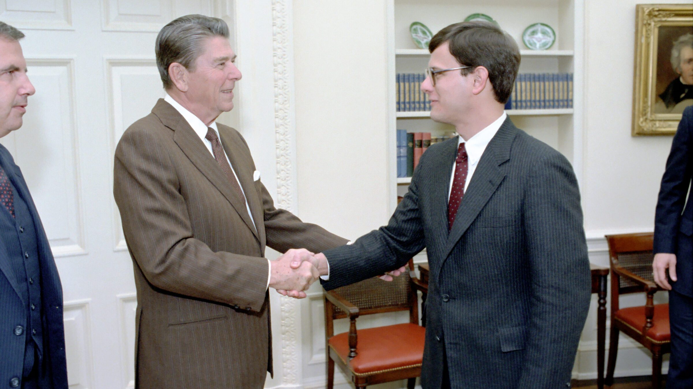 Roberts shakes hands with President Ronald Reagan in the Oval Office, January 1983 (Reagan Library/National Archives)