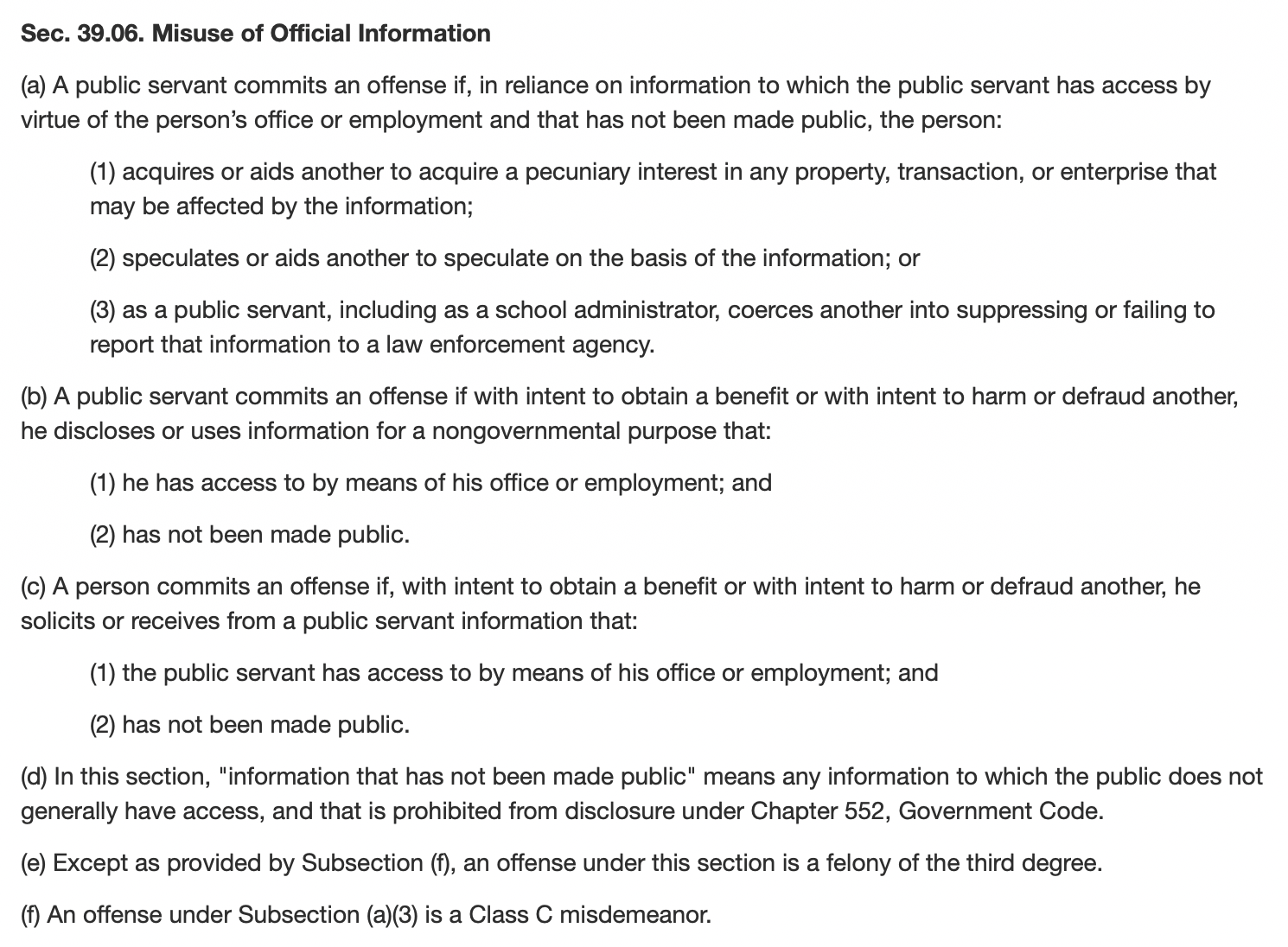 If you read the previous three paragraphs and are a little confused about how Texas could possibly have a statute that makes it a crime for a journalist to ask routine questions of public officials, you are right to be skeptical. Section 39.06(c), which governs the “misuse of official information,” is a pretty straightforward anti-public corruption law. The first two subsections are concerned with preventing elected officials and public employees from using inside information to make money—for example, a city councilmember who invests in a business they know is about to win a lucrative government contract. Here, read it for yourself: